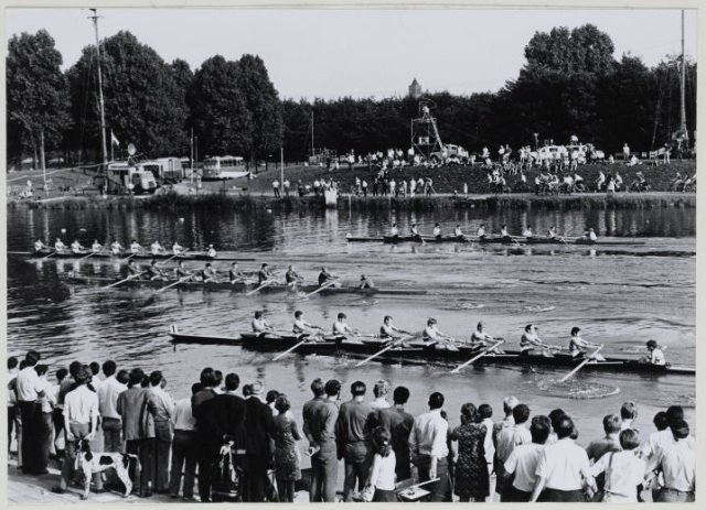 Wij hadden onze eigen wedstrijd, ook min of meer op het wereldtoneel. De bedrijfsachten wedstrijd over 1000 meter met een voorwedstrijd op zaterdag en de finale op zondag. De achten roeiden voorafgaand aan het hoofdnummer, de prestigieuze Holland Beker voor skiffeurs. Drie heats met 6 ploegen, de snelste 6 naar de finale. Pure nostalgie en jeugdsentiment voor de oud-wedstrijdroeiers in de Rowdow ploeg.